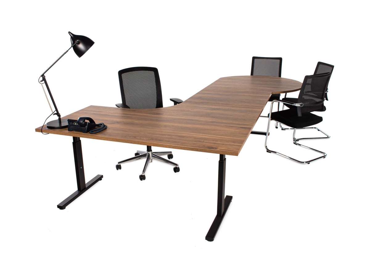 Een groot hoekbureau met vergaderdruppel voor 3 vergaderstoelen. Met name praktisch wanneer u vaak collega's of klanten aan uw bureau krijgt. Het hoekbureau heeft een zwart onderstel en Cognac Walnoten bladkleur. Het bureau is hoogte instelbaar en het bureaublad is zowel links als rechtsom te monteren. De roldeurkast kunt u optioneel los erbij bestellen.