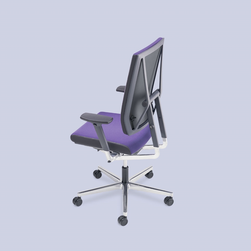 Eenvoudig te begrijpen symbolen verduidelijken de functies van de afzonderlijke instelknoppen. Breedte van de armleuningen regelbaar met een geïntegreerd klemsysteem. De beklede rugleuning kan indien gewenst ook worden uitgebreid met een in diepte verstelbare lumbaalsteun, waarvan de bediening eveneens esthetisch in het oppervlak geïntegreerd zijn. De veerkracht van de rugleuningweerstand kan eenvoudig door middel van een schuifknop worden versteld.