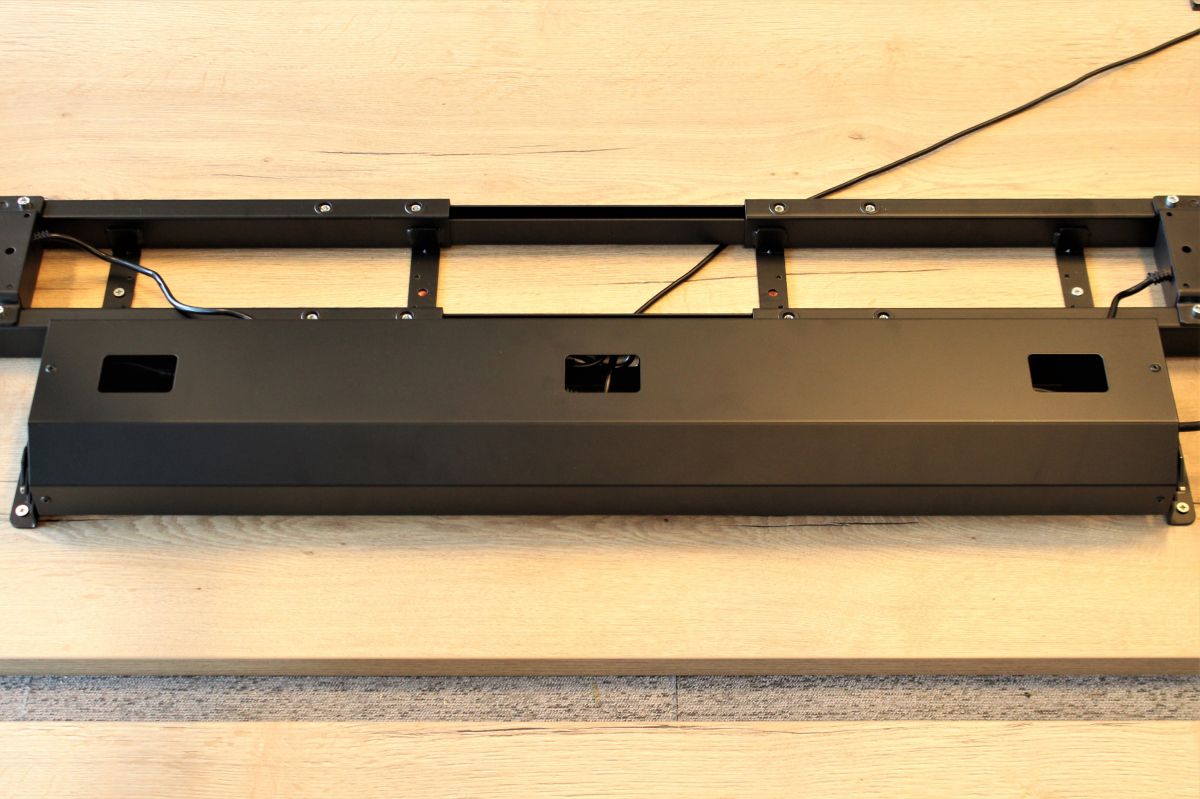 Zwarte metalen kabelgoot en stekkerdoos
