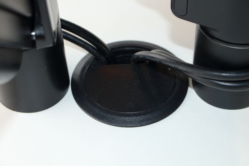Zwarte metalen kabelgoot, stekkerdoos en kabeldoorvoergat.